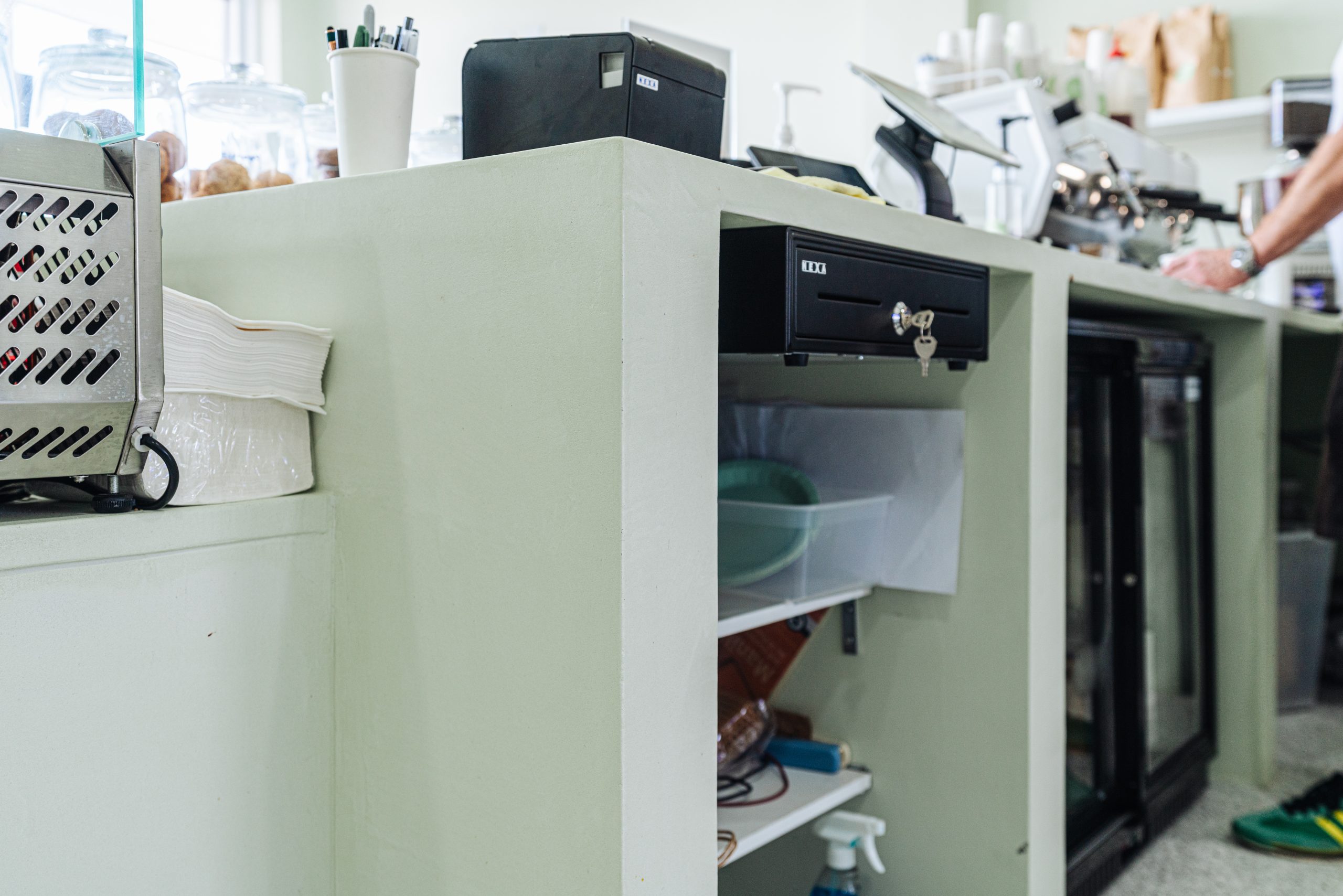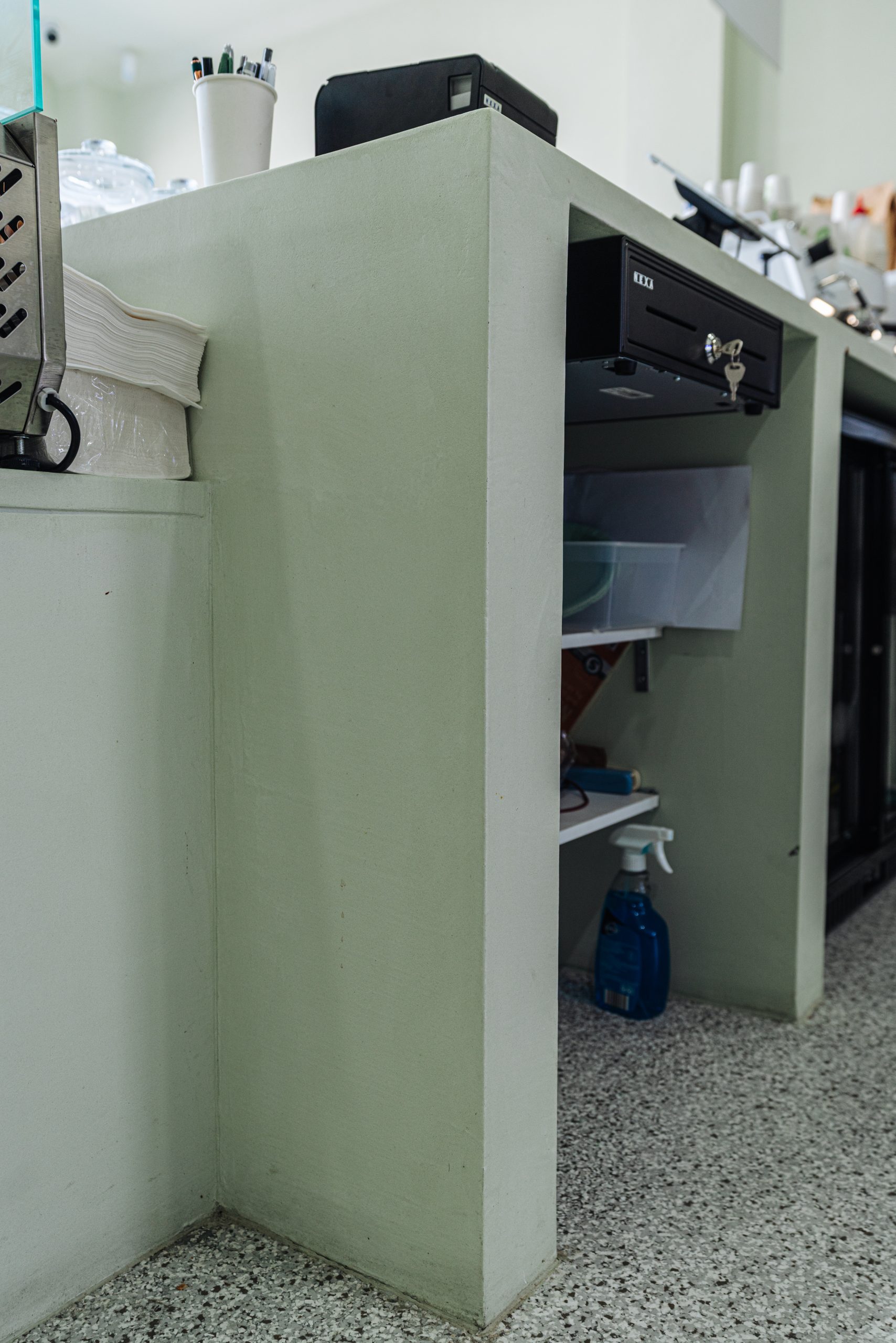 A fresh, contemporary space in Sylvania Waters, brought to life through a custom mint green microcement finish. Selected for its durability and seamless application, microcement was the ideal solution for this high-traffic commercial environment — delivering both performance and a refined aesthetic.