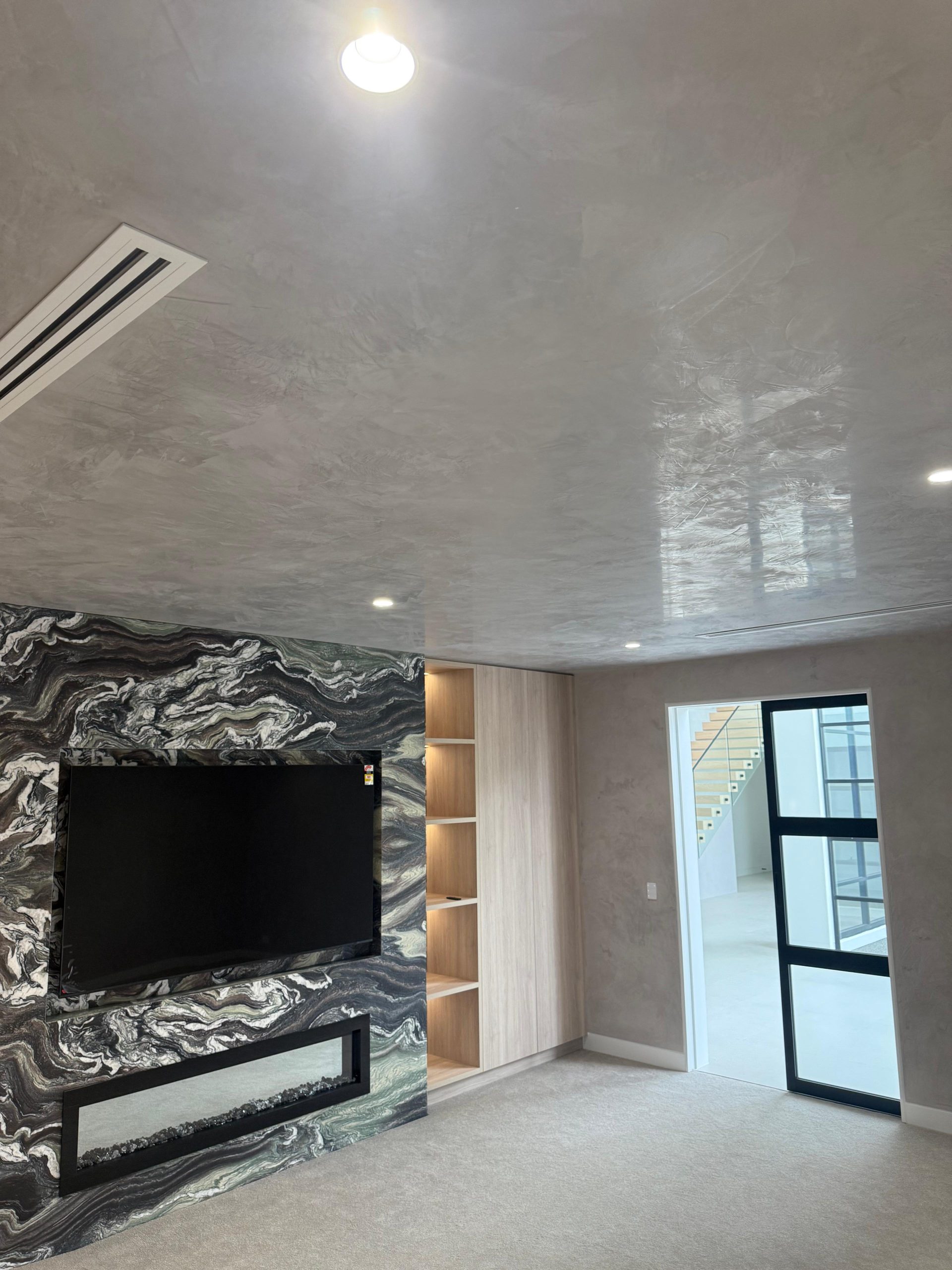 Often overlooked, the ceiling becomes a statement surface with Venetian Plaster — adding dimension and craftsmanship that elevates the entire room.